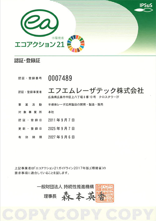 エフエムレーザテック株式会社は、半導体レーザ応用機器の開発・製造・販売を行うことで、顧客のニーズと期待に応え、社会貢献を目指す会社である。当社の事業活動を通じて環境保全活動に取り組み、地球環境に貢献していくことを目指す。