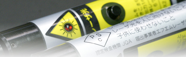 弊社の(乾電池駆動式)レーザーポインター標準製品全機種は、消費生活用製品安全法「携帯用レーザー応用装置」の技術上の基準に適合しており、2001年8月に財団法人日本品質保証機構(JQA)の適合性検査にパスしています。